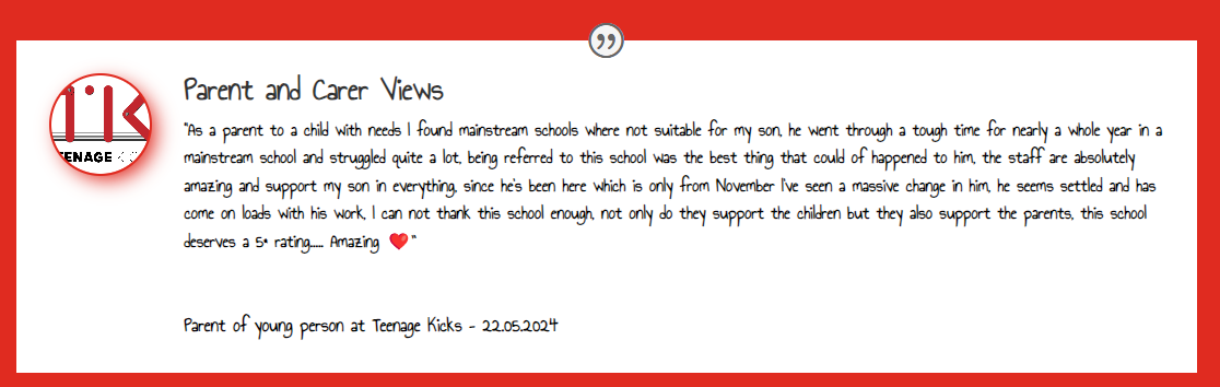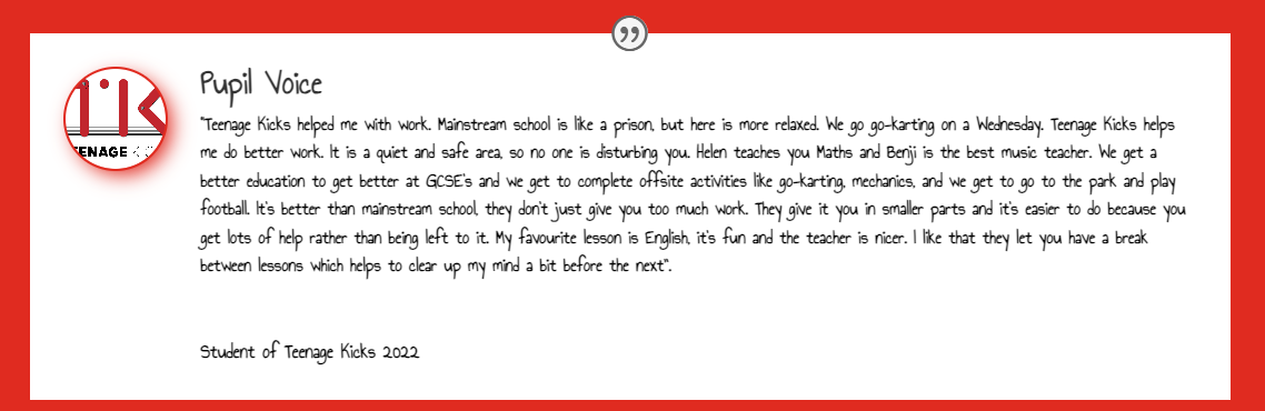 At Teenage Kicks, we pride ourselves on unlocking the potential of all our young people so that they can become the best version of themselves. At Teenage Kicks, we work collaboratively and pride ourselves on creating a stimulating, positive learning environment whereby all our pupils can achieve. We offer an inclusive, creating and inspiring learning environment for up to 80 pupils of secondary school age and work tirelessly to make learning stimulating and fulfilling for all.